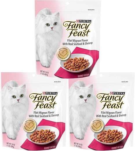 Per page 127 Items Sort By. Fancy Feast Gourmet Dry Cat Food - Filet Mignon Flavor with Real Seafood Shrimp - 3 Pack 3 Pounds Total.